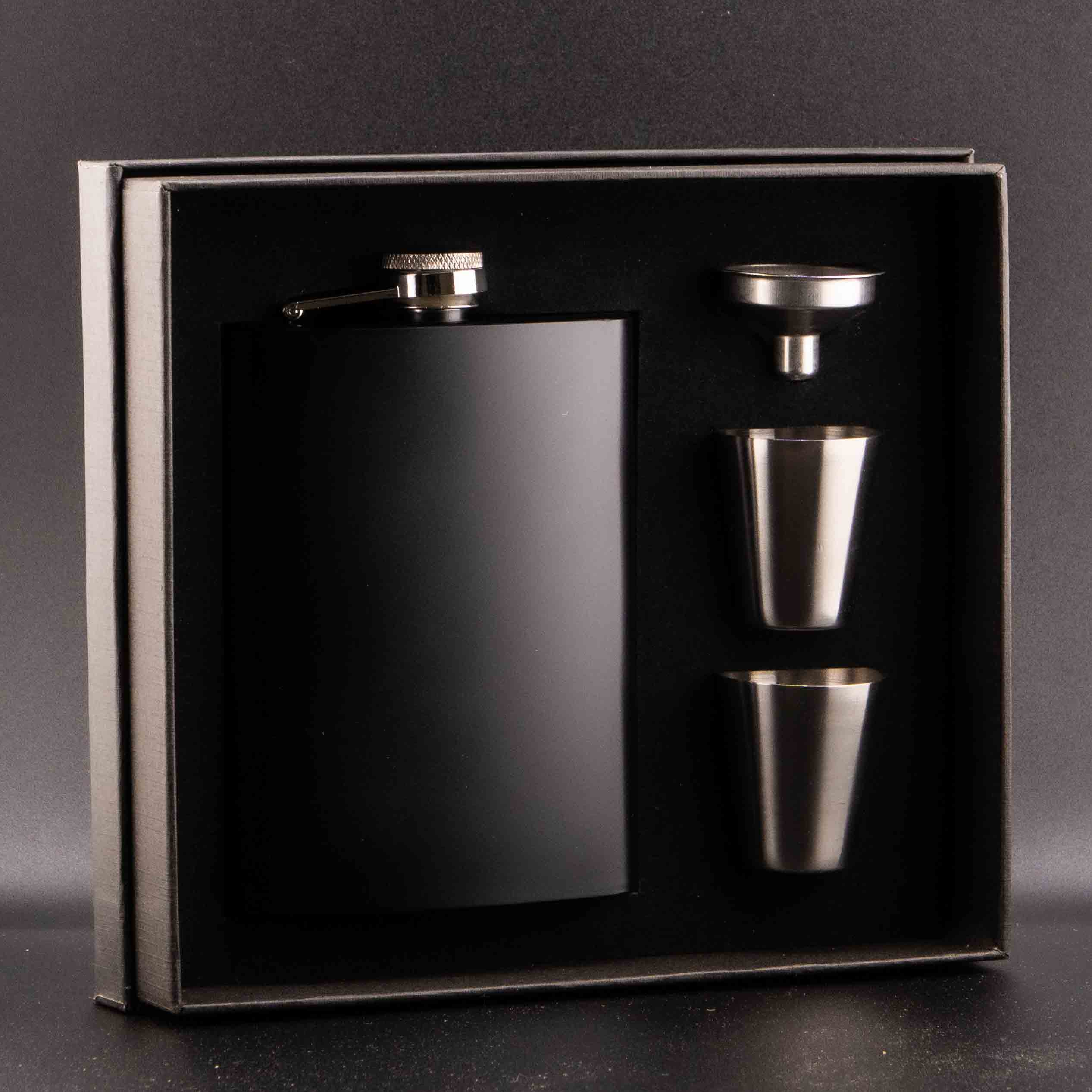 Elegantni poklon set koji sadrži crnu metalnu pljosku kapaciteta 235 ml i dve čašice, upakovane u crnu poklon kutiju.